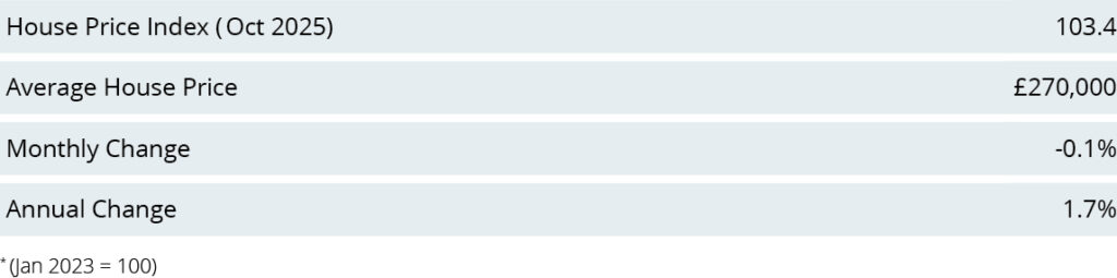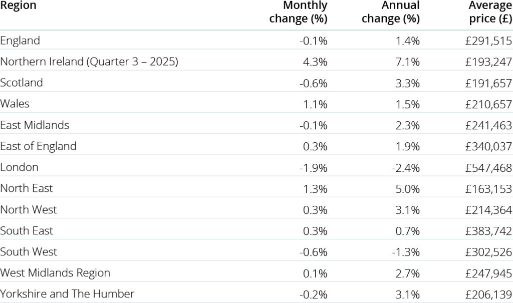 - Average house prices in the UK increased by 1.7% in the year to October 2025