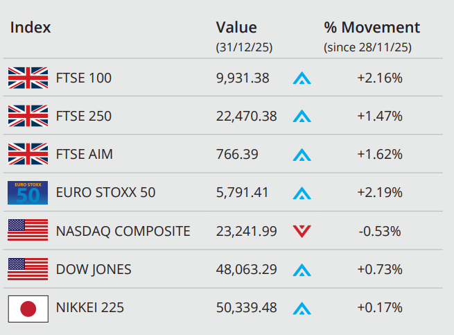 Although major global indices closed 2025 higher year-on-year, trading at month end was mixed, with many markets closing lower on the last day of the year.